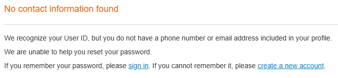 If you get this screen, it means that your User ID was correct, but the email or phone number you entered is not associated with that account.
